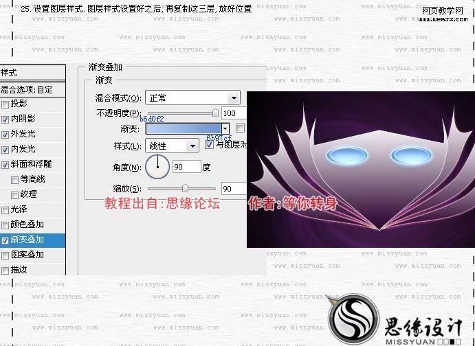 23、圖層樣式:內陰影,外發光。 24、圖層樣式:內發光,斜面和浮雕。 25、圖層樣式:漸變疊加。設置好之后,分別復制剛才操作的三個圖層,然后放好位置,如下圖。