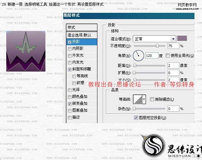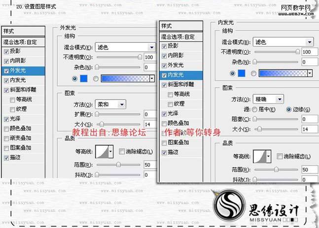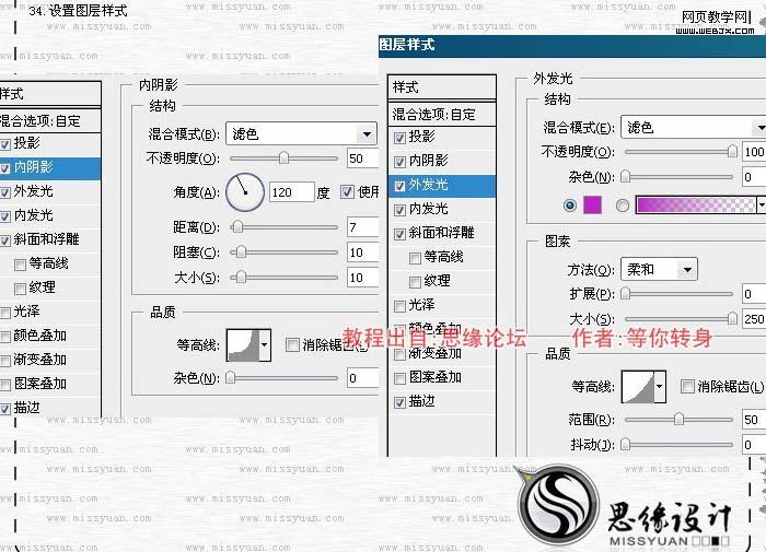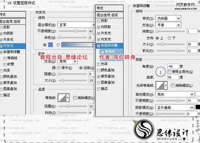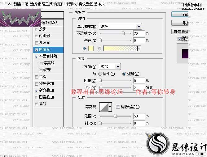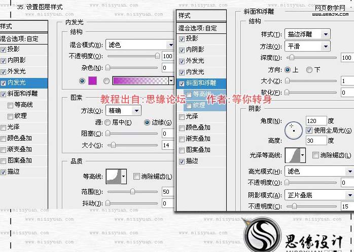 35、設置圖層樣式:內發光,斜面和浮雕。 36、設置圖層樣式:描邊,大致效果如下圖右。 37、添加圖層蒙版,去掉不需要的部分。