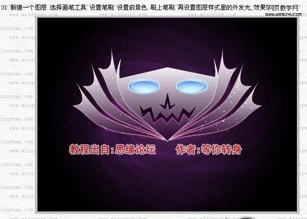 29、新建一個圖層,選擇鋼筆工具繪出下圖所示的路徑,填充顏色后再設置圖層樣式。 30、設置圖層樣式:斜面和浮雕,漸變疊加。 31、新建一個圖層,選擇畫筆工具,設置好筆刷和前景色,然后刷上一些星星筆刷,設置圖層樣式的外發光,效果如下圖。