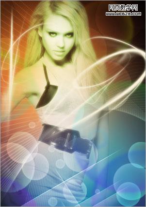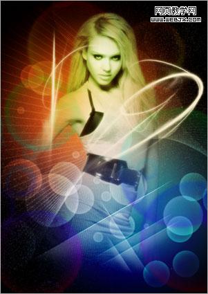 11、重復(fù)步驟 8、9,創(chuàng)建比之前定義筆刷稍大的筆刷。采用同步驟 10相同的設(shè)置繪制較大的透明圓。雙擊圓形圖層打開圖層混合樣式窗口,選擇漸變疊加并設(shè)置漸變條。 12、創(chuàng)建新畫布,背景設(shè)為黑色,創(chuàng)建新圖層,使用鉛筆工具繪制1px的白色直線,并用柔角橡皮擦工具處理直線的兩端。創(chuàng)建新圖層,選擇柔角筆刷工具,將筆刷不透明度設(shè)為50%,沿直線涂抹畫布,使用橡皮擦工具將直線左側(cè)的部分擦除得到如下效果。 13、將上述帶光暈的直線拖入畫布,并復(fù)制多次,調(diào)整不同的位置和方向。下載放射線條筆刷,在人像層下方創(chuàng)建新圖層,并使用筆刷添加放射線條效果。