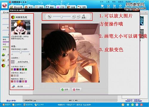hoho~~~終于解決偶滴問題落,效果是不是很好?有同樣煩惱的你們是不是也想學(xué)學(xué)呢,一起來看看吧,跟上偶的腳步哦。新增的局部變色筆可以讓皮膚白亮起來哦,很簡單的呢,用鼠標(biāo)拖來拖去就可以了呢。
