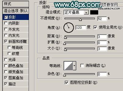 2、選擇菜單:圖層 > 圖層樣式 > 投影,參數設置如下圖。