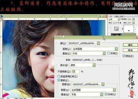 5、新建一個(gè)圖層,蓋印圖層,執(zhí)行:圖像 > 應(yīng)用圖像操作,參數(shù)設(shè)置如下圖。確定后用圖章工具修復(fù)人物臉部較大的斑點(diǎn)。 6、創(chuàng)建曲線調(diào)整圖層,參數(shù)設(shè)置如下圖,確定后完成最終效果。