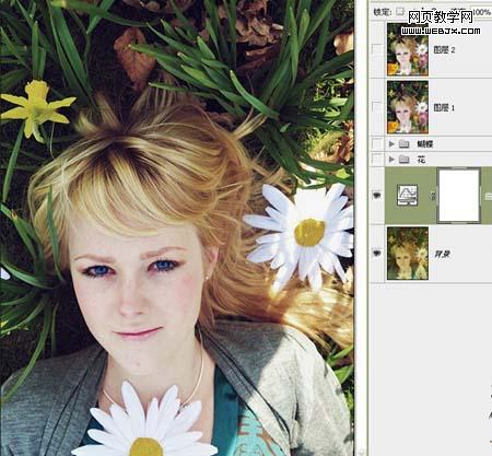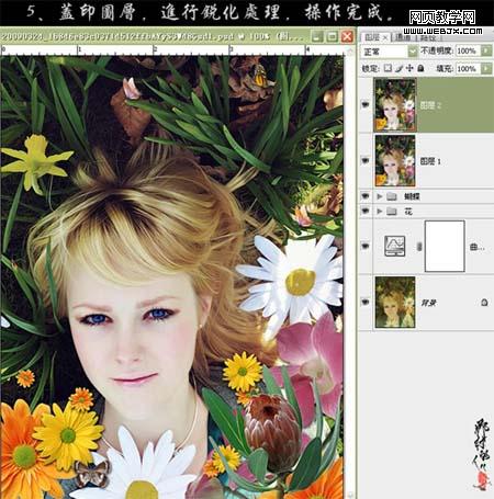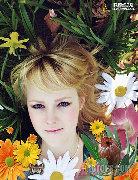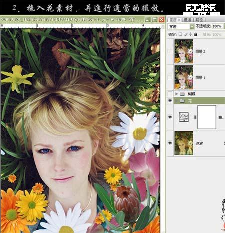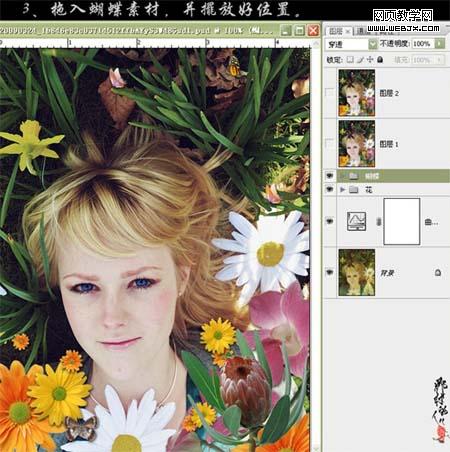2、找一些鮮花素材,把花朵摳出來,擺好位置,如下圖。 3、找一些蝴蝶素材,摳出來,擺好位置。