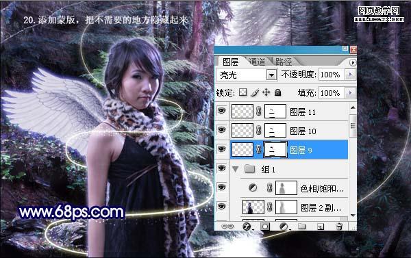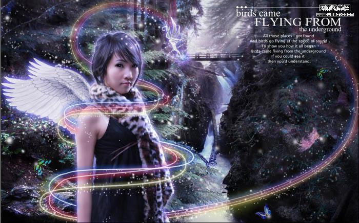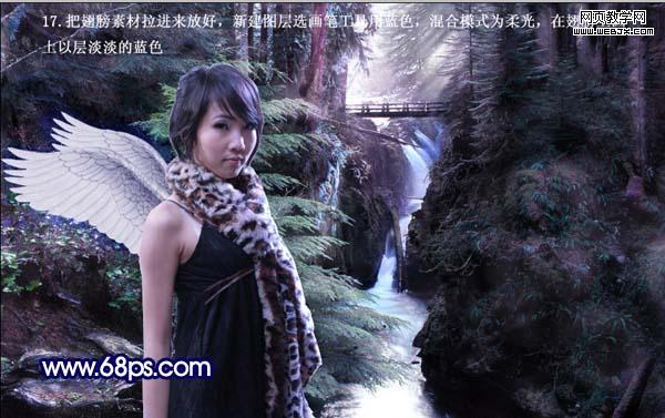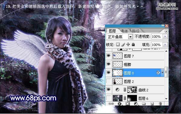 16、把美女和美女副本蓋印一張(ctrl + alt + e),創建色相/飽和度調整圖層,參數設置如下圖。 17、打開下圖所示的翅膀素材,把翅膀摳出來,復制進來放好位置,新建一個圖層,圖層混合模式改為“柔光”,然后用藍色畫筆把翅膀涂成淡淡藍色。 18、把美女和翅膀圖選中然后載入選區,新建圖層填充白色,添加外發光,顏色選擇淡藍色。
