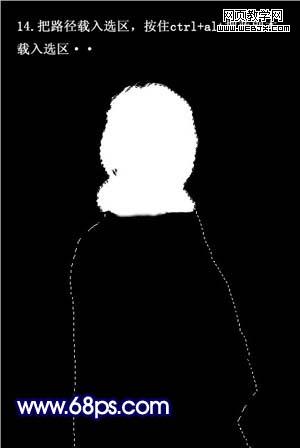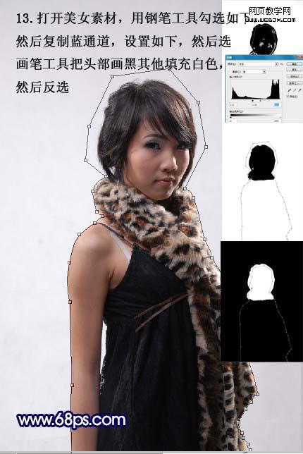 13、打開下圖所示的人物素材,用鋼筆工具勾出下圖所示路徑,然后復制藍色通道,按ctrl + l調整下色階,用畫筆把頭部畫黑,其它填充白色,按ctrl + i反選。這一步是通道摳圖,可以選擇自己拿手的摳圖方法。 14、把路徑轉為選區,按ctrl + alt + ~ 把藍副本載入選區。 15、把摳好的人物圖片拖進來,復制一張,把下面的一張圖層混合模式改為“正片疊底”,在副本中加上圖層蒙版,用黑色畫筆擦掉頭發邊緣的白邊。