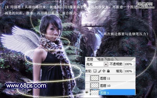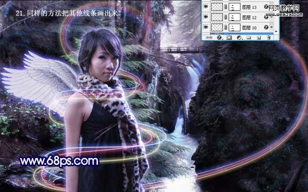 19、用鋼筆工具畫出路徑來,新建圖層用3像素畫筆描邊,添加外發光,再新建一個圖層,設置畫筆的間距,散布,再用路徑描邊,圖層混合模式改為“亮光”。 20、添加圖層蒙版,用黑色畫筆擦掉不需要的部位。 21、同樣的方法制作其它線條。