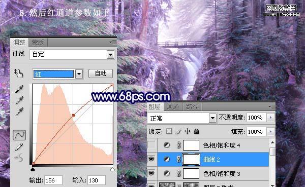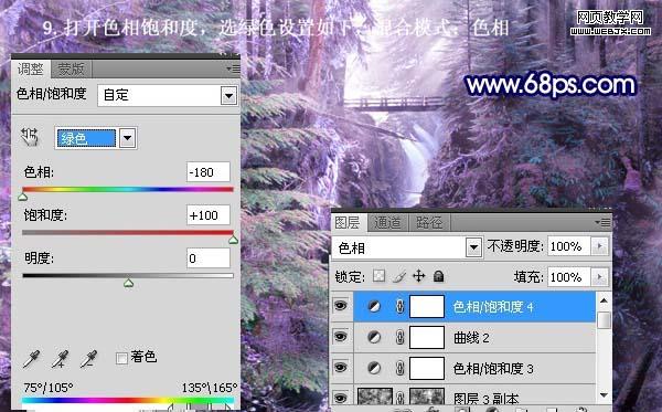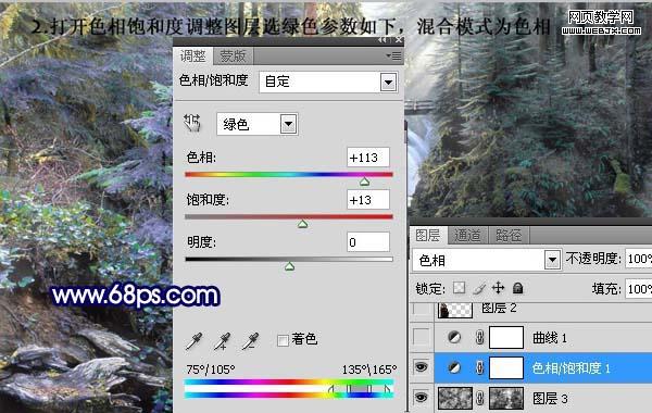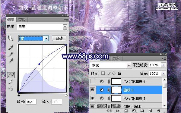 7、創建曲線調整圖層,對藍色進行調整,參數設置如下圖。 8、紅色通道調整數值。 9、創建色相/飽和度調整圖層,對綠色進行調整,參數設置如下圖,確定后把圖層混合模式改為“色相”。