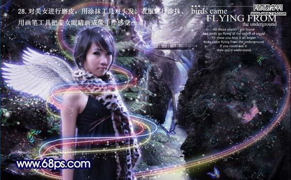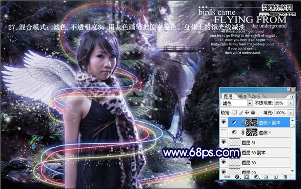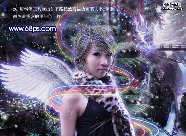 27、曲線調整圖層圖層混合模式改為“濾色”,不透明度改為:35%,用灰色畫筆把人物身體及臉部的光線擦掉。 28、對人物進行磨皮,用涂抹工具對頭發、衣服進行涂抹。用畫筆工具把人物眼睛畫成像手繪感覺。 29、用鋼筆工具畫出如下路徑,然后描邊畫筆大小1像素,顏色跟頭發的中間色一樣。