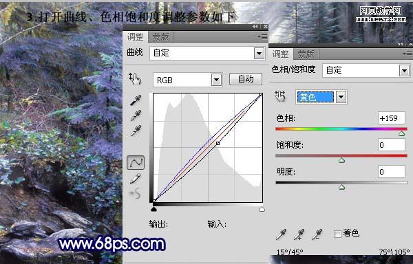 1、打開原圖素材,新建一個圖層執行:濾鏡 > 渲染 > 云彩,確定后把圖層混合模式改為“濾色”,添加圖層蒙版用黑色畫筆把需要的地方擦掉。 2、創建色相/飽和度調整圖層,對綠色進行調整,參數設置如下圖,確定后把圖層混合模式改為“色相”。 3、創建創建曲線調整圖層,對rgb及藍色進行調整,參數設置如下圖,確定后再創建色相/飽和度調整圖層,參數設置如下圖。