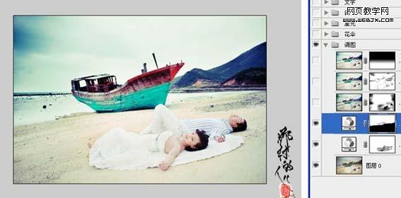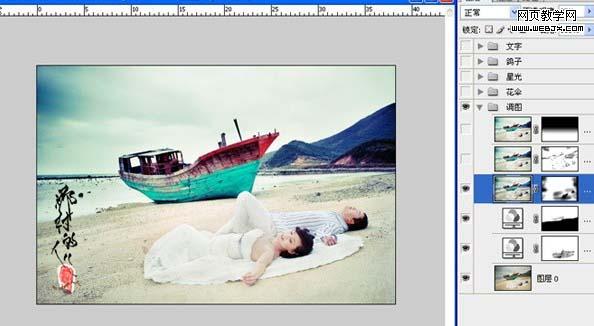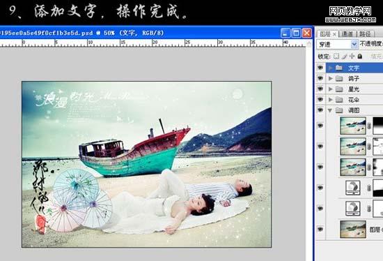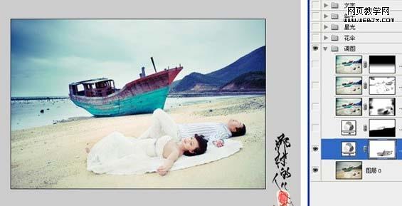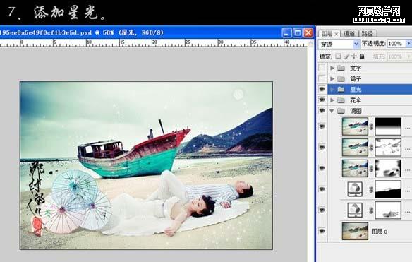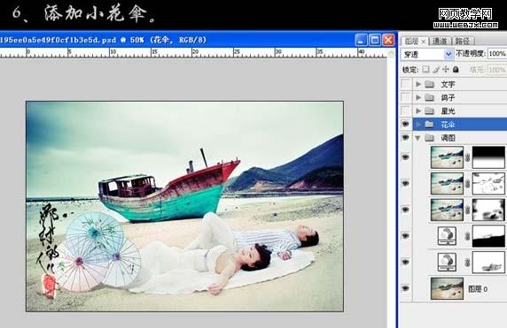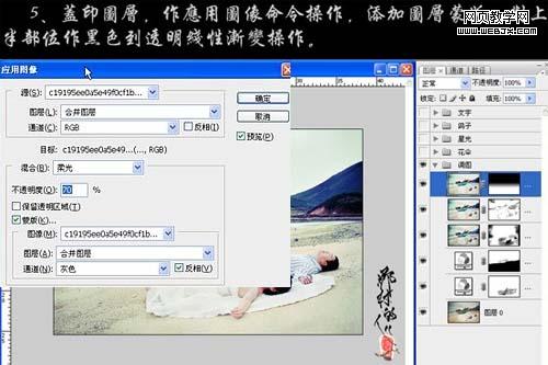 5、新建一個(gè)圖層,蓋印圖層,執(zhí)行:圖像 > 應(yīng)用圖像操作,參數(shù)設(shè)置如下圖,確定后加上圖層蒙版,對(duì)上半部位做黑色到透明線性漸變操作。 6、找一些花傘素材,摳出來(lái)復(fù)制進(jìn)來(lái)放好位置,如下圖。 7、新建一個(gè)圖層,用畫(huà)筆刷一些星星筆刷。