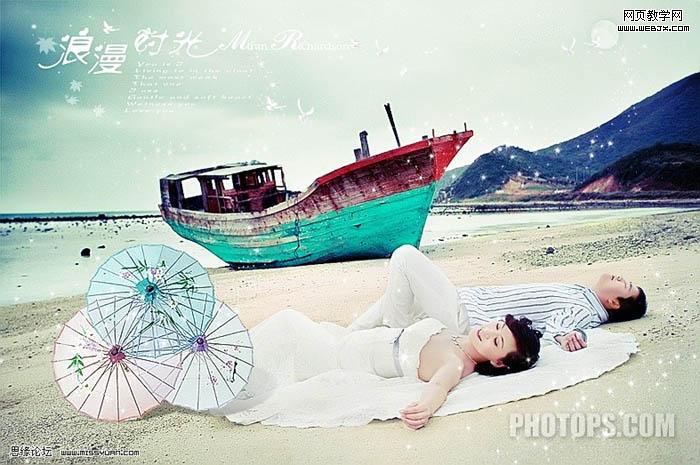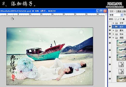 8、找一些鴿子素材,摳出后填充白色,拖進(jìn)來(lái),適當(dāng)調(diào)整大小,如下圖。 9、最后加上裝飾文字,完成最終效果。