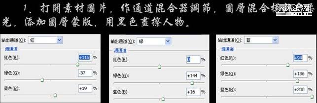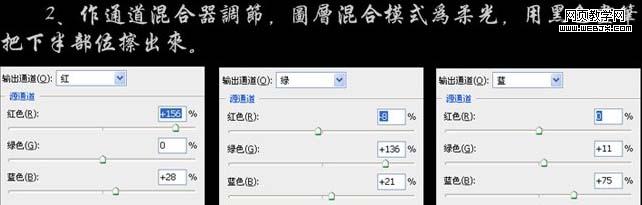 1、打開(kāi)素材圖片,創(chuàng)建通道混合器調(diào)整圖層,參數(shù)設(shè)置如下圖,確定后把圖層混合模式改為“柔光”,用黑色畫(huà)筆在蒙版上把人物擦出來(lái)。 2、再創(chuàng)建通道混合器調(diào)整圖層,參數(shù)設(shè)置如下圖,確定后把圖層混合模式改為“柔光”,用紅色畫(huà)筆把下巴部位擦出來(lái)。