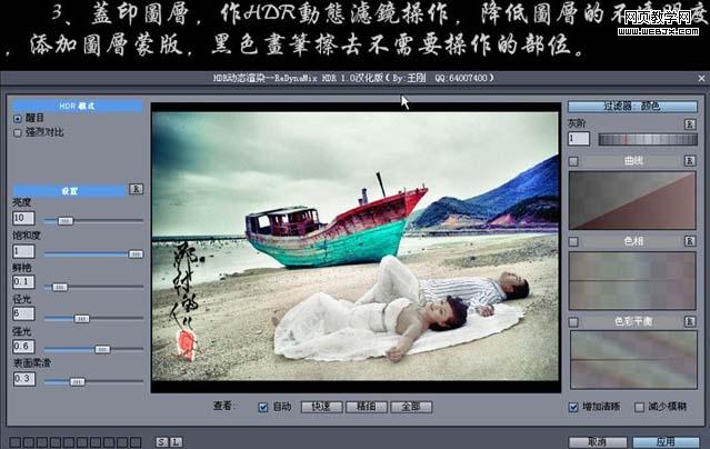 3、新建一個(gè)圖層,按ctrl + alt + shift + e蓋印圖層,用外掛濾鏡:hdr濾鏡操作(如果沒(méi)有安裝可以去網(wǎng)上下載),參數(shù)設(shè)置如下圖,確定后把圖層不透明度改為:27,加上圖層蒙版,用黑色畫(huà)筆擦去不需要操作的部位。 4、新建一個(gè)圖層,蓋印圖層,適當(dāng)?shù)膱D層銳化一下。
