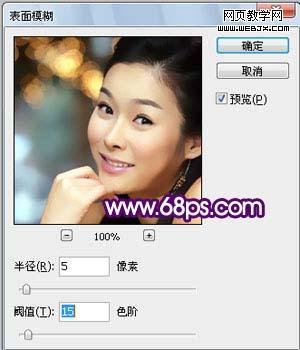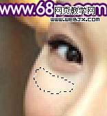 2、祛眼袋:用多邊形套索工具做出如圖所示的選區。選擇-修改-羽化,半徑設置為2個像素。輕按幾下鍵盤上的向下箭頭,將選區移動到如圖所示的位置,按下ctrl+j得到復制的圖層(同樣的得到了選區內的皮膚)。使用工具條里的移動工具將剛剛得到的皮膚移動到最初建立選區的地方(有眼袋的地方)。填充度改為79%,用同樣的方法去掉另外一只眼睛的眼袋。 3、按ctrl+shift+alt+e蓋印圖層,執行:濾鏡-模糊-表面模糊,點擊確定后,編輯-漸隱表面模糊,不透明度設置為80%。