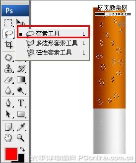 5、選擇工具箱中的套索工具,在圖層煙頭上并按鍵盤shift鍵不放,在煙頭上不規則的選擇,接著選擇“圖象/調整/