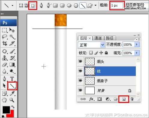 6、在圖層控制面板擊新建圖層按鈕,新建一個“線”,在工具箱中選擇直線工具 ,按住鍵盤shift鍵不放在工作區中