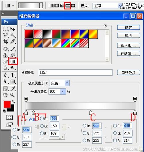 狀,接著選擇工具箱漸變工具(快捷鍵g),在工具選項欄中設置為對稱漸變,然后點按可編輯漸變,彈出漸變編輯器。