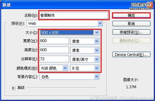 1、選擇“文件/新建”菜單,打開”新建”或者ctrl+n對話框 名稱為:香煙制作,寬度:為570像素, 高度:為600像素,