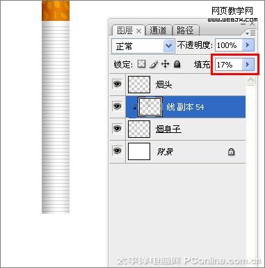 8、在先副本54圖層和煙身子圖層按鍵盤alt,然后設置填充為17%,效果如圖13所示。