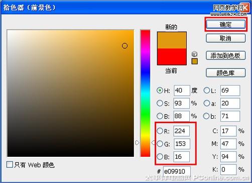4、選擇工具箱前景色,然后彈出拾色器,設置拾色器rgb分別為224、153、16,然后單擊確定按鈕,如圖6所示。