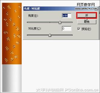 9、選擇工具箱中的單行選框工具,在圖層煙頭執行“圖象/調整/亮度/對比度”菜單,彈出亮度/對比度對話框,設置亮度