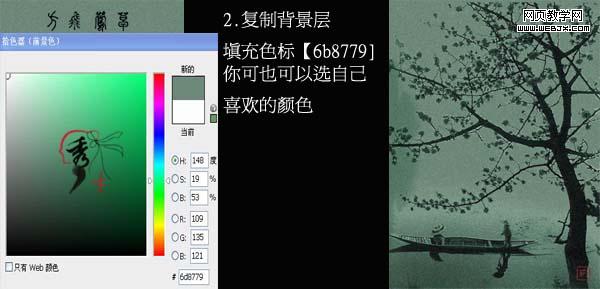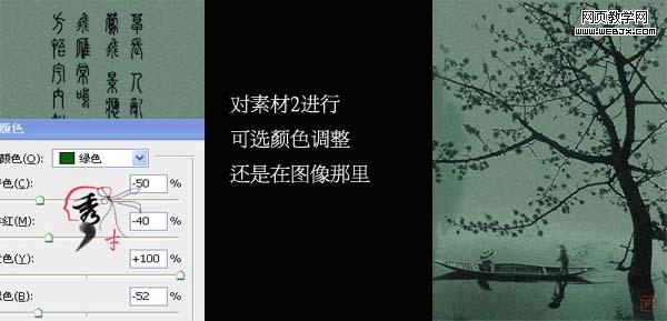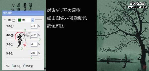 1、新建一個1200 * 580 像素文件,背景為白色。 2、新建一個圖層填充顏色:#6b8779,也可以填充自己喜歡的顏色。打開素材1拖進來放好位置,圖層混合模式改為“正片疊底”。 3、對素材1再次調(diào)整,點擊圖像 > 調(diào)整 > 可選顏色,參數(shù)設(shè)置如下圖。