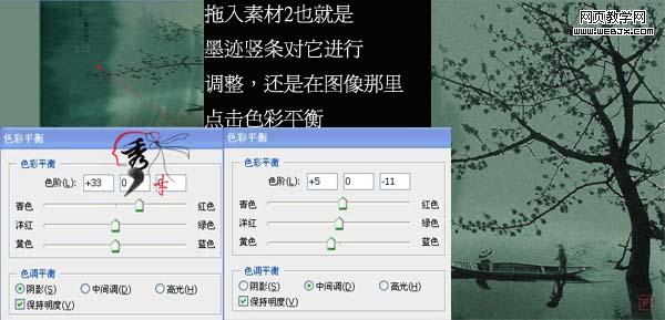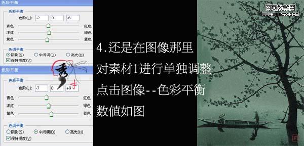 4、再對素材1調(diào)整色彩平衡(ctrl + b),參數(shù)設(shè)置如下圖。 5、打開素材2,拖進來放好位置,圖層混合模式改為“正片疊底”,然后按ctrl + b調(diào)整色彩平衡參數(shù)設(shè)置如下圖,添加圖層蒙版,把素材2的邊緣部分擦掉,如下圖。