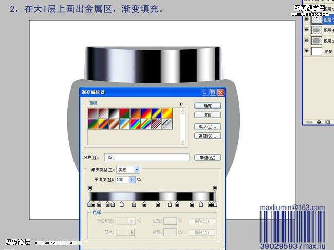 2、在瓶蓋圖層上拉出金色漸變,顏色設置如下圖。 3、用加深/減淡工具修飾細節。 4、將第2大層劃分為4個區,分別填充不同的綠色。