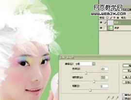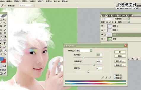 13、在人物眼尾處做選區(qū),羽化半徑為20 象素,復制選區(qū)圖層,執(zhí)行色相/ 飽和度,參數(shù)如下: 色相-33、飽和度+39。 |