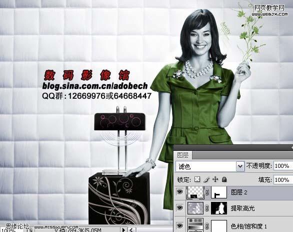 2、打開下圖所示的花紋素材,用魔術(shù)棒摳出來后填充為綠色,復(fù)制進來,移至右手的位置,圖層混合模式改為“正片疊底”,把不要的部分用橡皮擦刪掉。