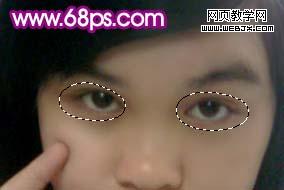3、新建一個圖層,蓋印圖層,用套索工具把眼睛周圍較暗部分選取出來如圖4,按ctrl + alt + d羽化5個像素,按ctrl + j復(fù)制到新的圖層,圖層混合模式改為“濾色”,圖層不透明度改為:20%,效果如圖5。