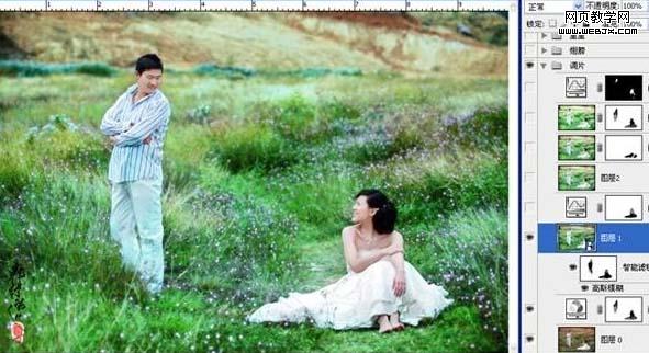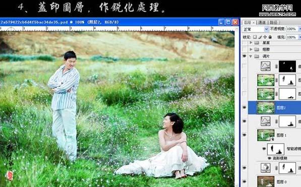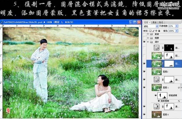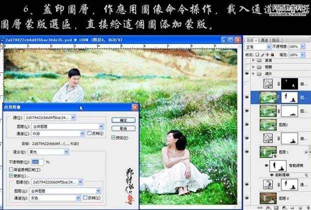 4、新建一個圖層,蓋印圖層,適當(dāng)?shù)陌蓤D層銳化一下。 5、把當(dāng)前操作圖層復(fù)制一層,圖層混合模式改為“濾色”。降低圖層不透明度,添加圖層蒙版,用黑色畫筆把女主角的裙子擦出來。 6、新建一個圖層,蓋印圖層,執(zhí)行:圖像 > 應(yīng)用圖像操作,參數(shù)設(shè)置如下圖,載入通道混合器圖層蒙版選區(qū),直接給這個圖層添加蒙版。