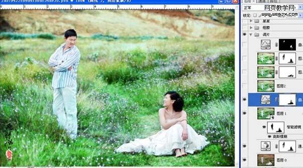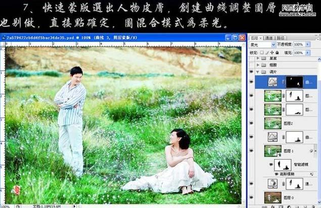 7、用快速蒙版選出人物皮膚,創(chuàng)建曲線調(diào)整圖層,什么也不需要調(diào)整,確定后把圖層混合模式改為“柔光”。 8、找一些翅膀筆刷給女主角加上翅膀。