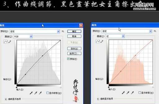 3、創(chuàng)建曲線調(diào)整圖層,參數(shù)設(shè)置如下圖,確定后用黑色畫筆把女主角部分擦出來。