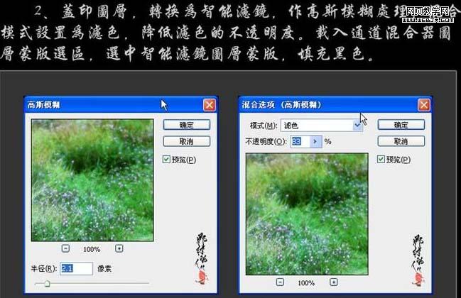 2、新建一個圖層,按ctrl + alt + shift + e 蓋印圖層,轉(zhuǎn)換為智能濾鏡(濾鏡 > 智能濾鏡。需要cs3及以上版本才有這款濾鏡),執(zhí)行:濾鏡 > 模糊 > 高斯模糊,參數(shù)設(shè)置如下圖,確定后把圖層混合模式改為“濾色”,降低濾色的不透明度。載入通道混合器調(diào)整圖層選區(qū),選中智能濾鏡圖層蒙版,填充黑色,如下圖。