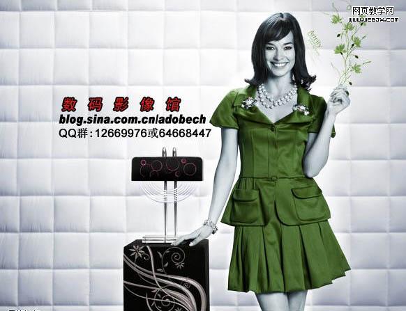 1、打開原圖素材,把背景圖層復(fù)制一層,按ctrl+i反相,然后把圖層混合模式改為“顏色”。 2、打開下圖所示的花紋素材,用魔術(shù)棒摳出來后填充為綠色,復(fù)制進來,移至右手的位置,圖層混合模式改為“正片疊底”,把不要的部分用橡皮擦刪掉。