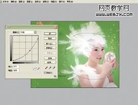 30、打開花紋素材。 31、將花紋素材拖入圖片中,適當調整好位置,多次復制花紋,將其中的一些花紋圖層適當降低不透明度,做為背景色,用文字工具在圖片上打出文字即可。 32、合并所有圖層,將人物圈出來反選,羽化值為250 像素。 33、曲線加深調整,效果如圖 。 34、最后用加深減淡工具在圖片四周和人物頭紗處做適當處理,讓整個圖象更有層次感,完成最終效果。