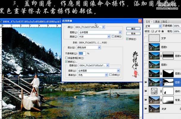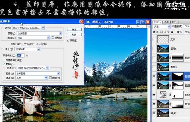 3、新建一個圖層,按ctrl + alt + shift + e蓋印圖層,執(zhí)行:圖像 > 應(yīng)用圖像操作,參數(shù)設(shè)置如下圖。確定后添加圖層蒙版用黑色畫筆擦去不需要操作的部位。 4、新建一個圖層,蓋印圖層,執(zhí)行:圖像 > 應(yīng)用圖像操作,參數(shù)設(shè)置如下圖。確定后添加圖層蒙版用黑色畫筆擦去不需要操作的部位。 5、新建一個圖層,蓋印圖層,對圖層時候銳化一下。