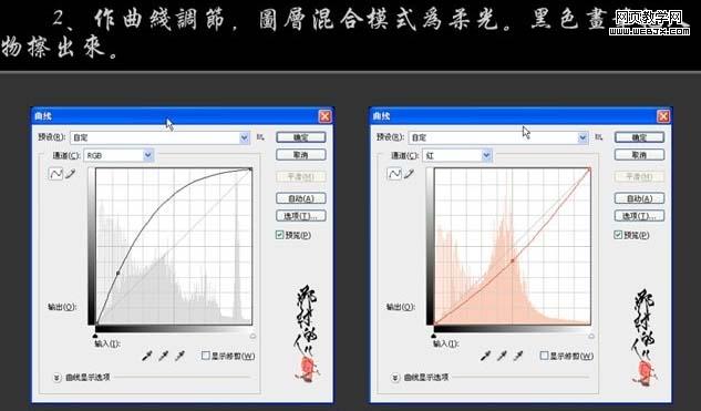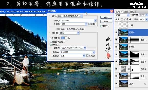 1、打開原圖素材,把背景圖層復(fù)制一層,執(zhí)行:圖像 > 應(yīng)用圖像操作,參數(shù)設(shè)置如下圖。確定后加上圖層蒙版用黑色畫筆把圖片下方擦出來。 2、創(chuàng)建曲線調(diào)整圖層,參數(shù)設(shè)置如下圖,確定后把圖層混合模式改為“柔光”。用黑色畫筆把人物擦出來。