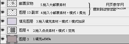 1、新建一個700 * 450 像素文件,背景填充顏色:#ad9d9e。 2、打開圖1所示素材,把圖層混合模式改為“變亮”。 3、打開圖2所示素材,拖進來,圖層混合模式改為“顏色加深”。 4、打開圖3所示的小郵票素材拖進來,圖層混合模式改為“柔光”。 5、打開圖4所示大郵票素材,拖進來。 |