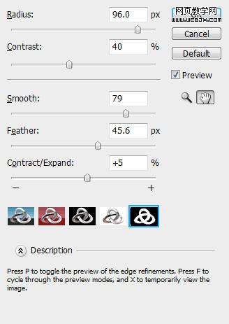 按ctrl + alt + r and bring up the refine edge tool, 應(yīng)用如下設(shè)置: