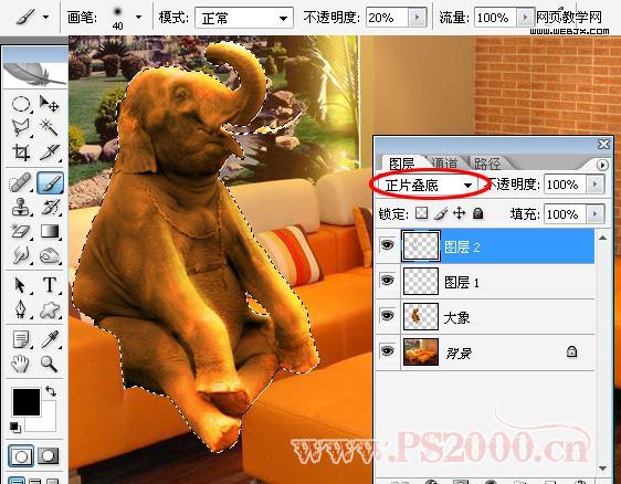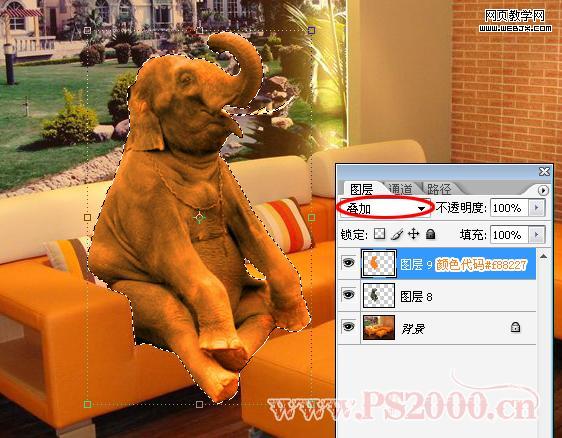 按ctrl鍵,鼠標點擊大象圖層,新建圖層,填充桔黃色(#88227),圖層改為疊加模式
