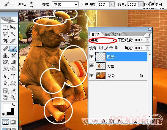 在象鼻、象頭頂等處(圖層圈圈處)反復涂抹,直至出現高光效果