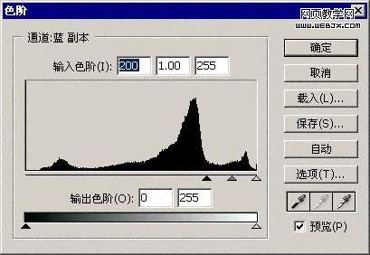 5、對(duì)藍(lán)色副本通道調(diào)整色階,將不必要的亮面調(diào)暗。