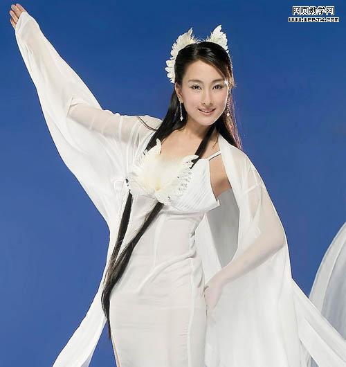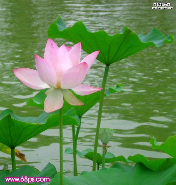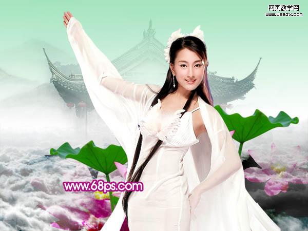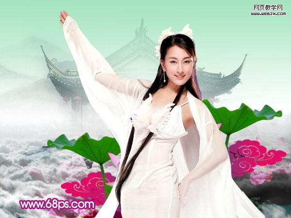 12、打開下圖所示的荷花素材,用鋼筆工具勾出來,放到人物圖層的下面,可以多復制幾份,效果如圖23。