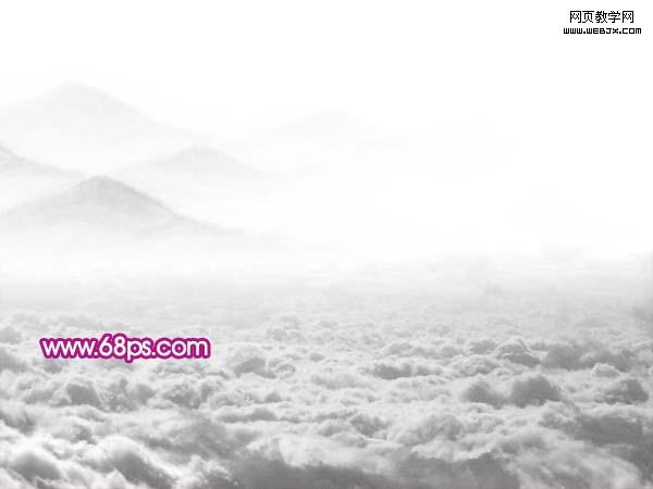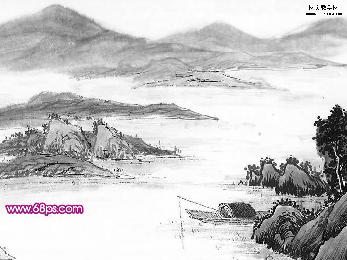 4、打開圖6所示的國畫,用鋼筆工具把山巒部分摳出來,然后復制進來,適當調整好透明度,效果如圖7。