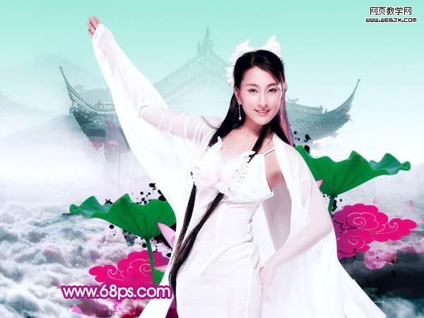 <圖28> 16、最后整體調整下顏色和細節,再裝飾一些小素材(如綢帶及一些水墨筆刷),并適當銳化一下,完成最終效果。