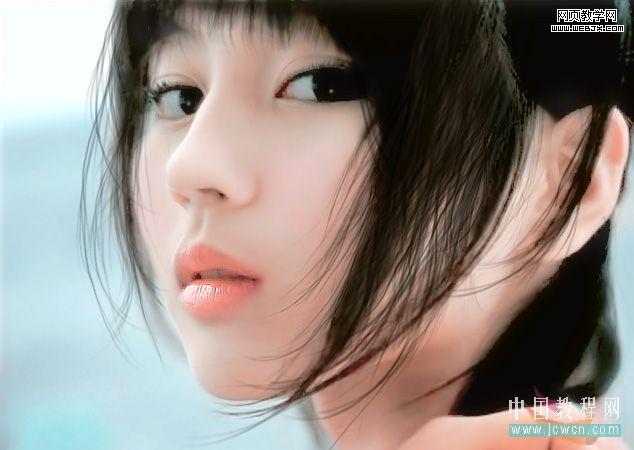 之后把圖層混合模式改為"顏色",不透明度設小一點。 14、按住ctrl鍵用鼠標左鍵點擊嘴唇顏色的那個圖層以載入圖層,即出現嘴唇的選區加個"亮度/對比度",使嘴唇明亮點[+5 ,+52],不透明度 30%。 15、仍然像第8步一樣,在lab模式下把顏色調鮮艷些[明度: 0, 1.27 ,255 ; a: 20, 0.99 ,235 ; b: 30, 0.91, 225]。 16、最后,按照自己的喜好,再調下細節并且可以"蓋印可見圖層",用 "濾鏡"-"雜色"-"減少雜色",加上"蒙版",把色斑雜點等消除一下。