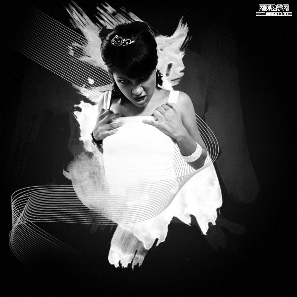 步驟 6、在人像層下方創(chuàng)建新圖層,應(yīng)用陣列曲線筆刷繪制出環(huán)繞人像的曲線效果,并使用柔角橡皮擦工具擦除曲線邊緣,得到漸入漸出效果。